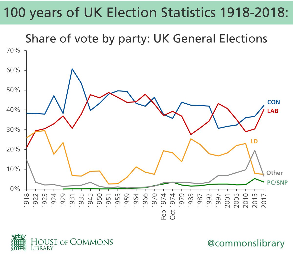 If anything, Blair moving Labour so far to the right actually increased the split on the Left. Because over the next ten years, many on the far left drifted away and didn't vote Labour (see examples on this very board) while the LDs re-positioned themselves as being economically and socially to the left of Blair, and split the left-of-centre vote (until they had to make a decision in 2010 of course - then they went all in on Tory Austerity. Bu that's the LDs for you...). That is why, by 2005 (in an election that they won handsomely), Labour's vote share was lower than the elections of 1951, 55, 59, 63, 70 and 1979, in which they lost heavily, and only a fraction above what Kinnock won in 1992, again when Labour lost.