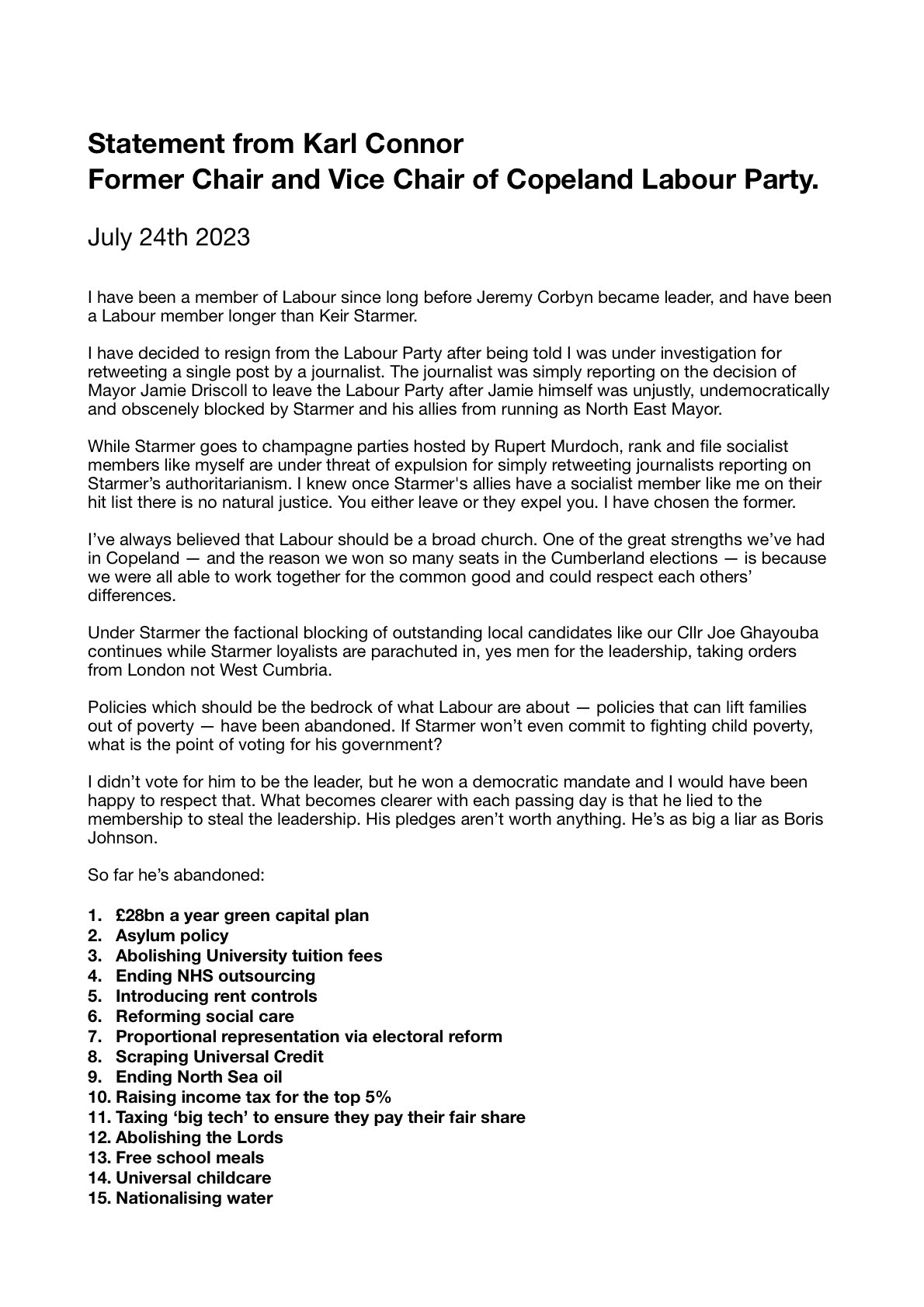 Statement from the former chair of Copeland Labour on his resignation;