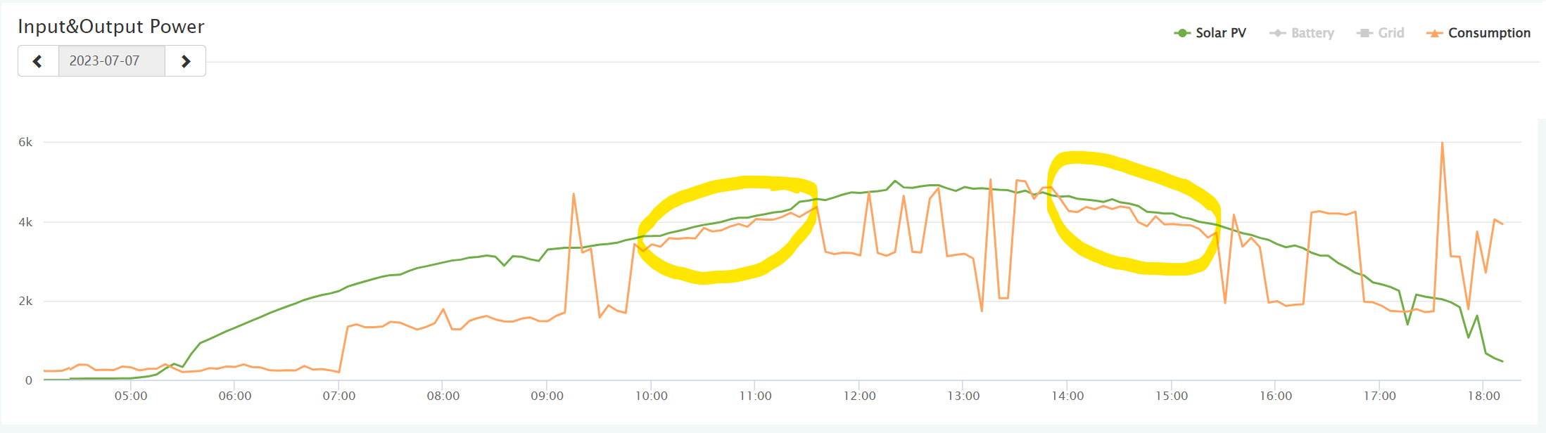 The 2 highlighted areas represent the EV charger automatically scaling the demand based on the surplus being generated - up before the midday peak and back down again at the other side.